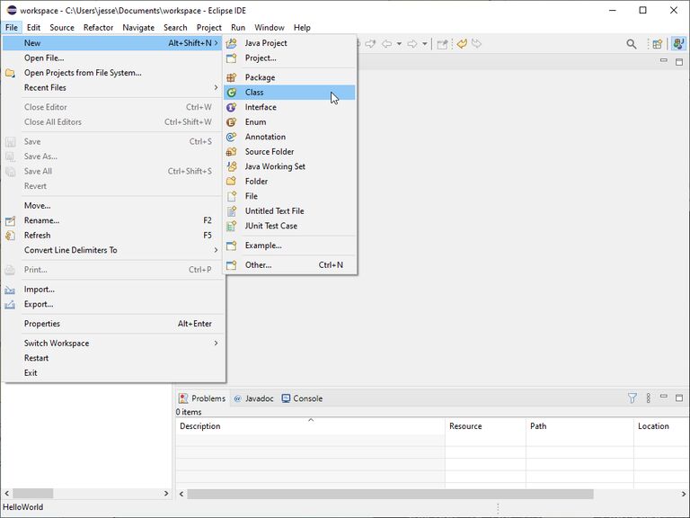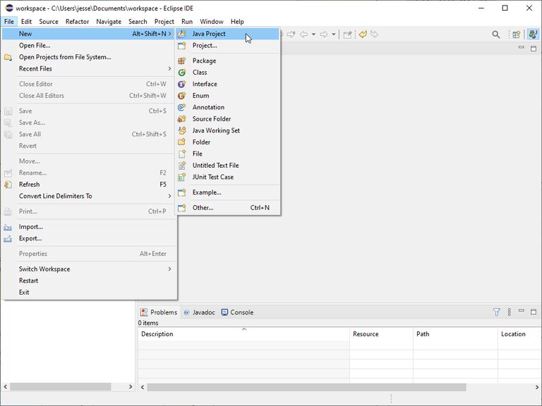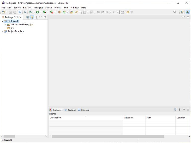 The Eclipse window is always organized according to a perspective. The current perspective determines the panels (views and editors) that are displayed in the Eclipse window. The default perspective when Eclipse is started for the first time is called the Java perspective which is where you will do a lot of your programming work for this class. For now, just take a look around the current window: note the menu bar at the top with a variety of menus (File, Edit, Help, etc.), the toolbar below it, and the various panels in the Java perspective (Package Explorer, Problems/Javadoc/Declaration, etc.). The big blank area is where the editor will appear when you start editing your Java programs. This is the typical structure of most Eclipse perspectives. We'll learn more about this in the following sections.