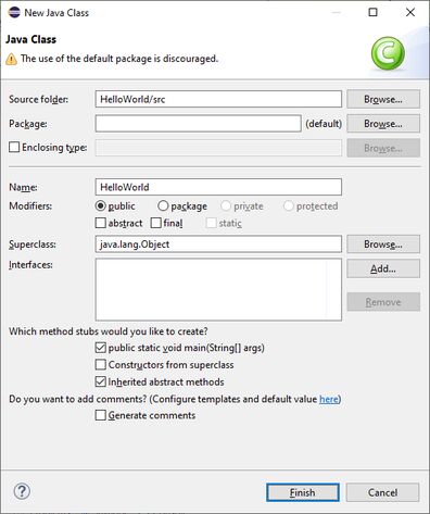 This opens the New Java Project wizard. Enter HelloWorld as the