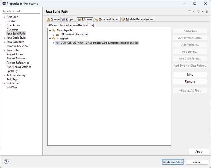 In the New Variable Classpath Entry window, select OSU_CSE_LIBRARY