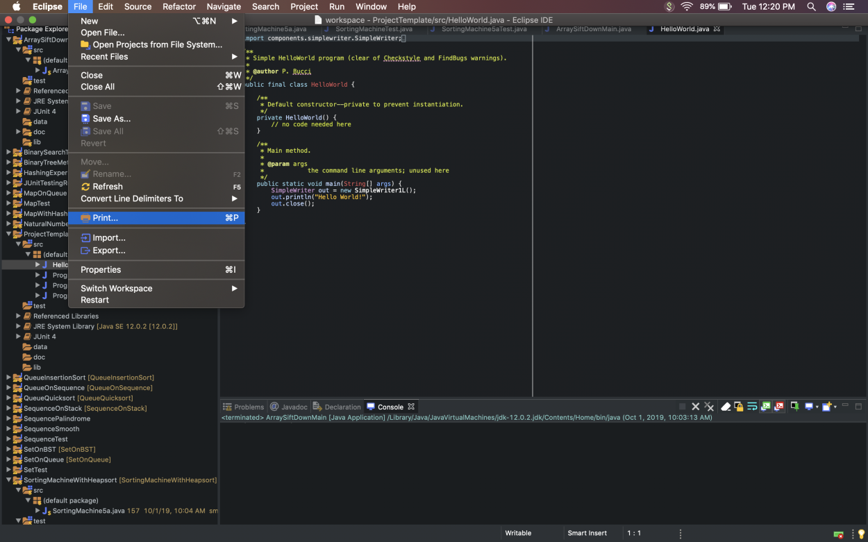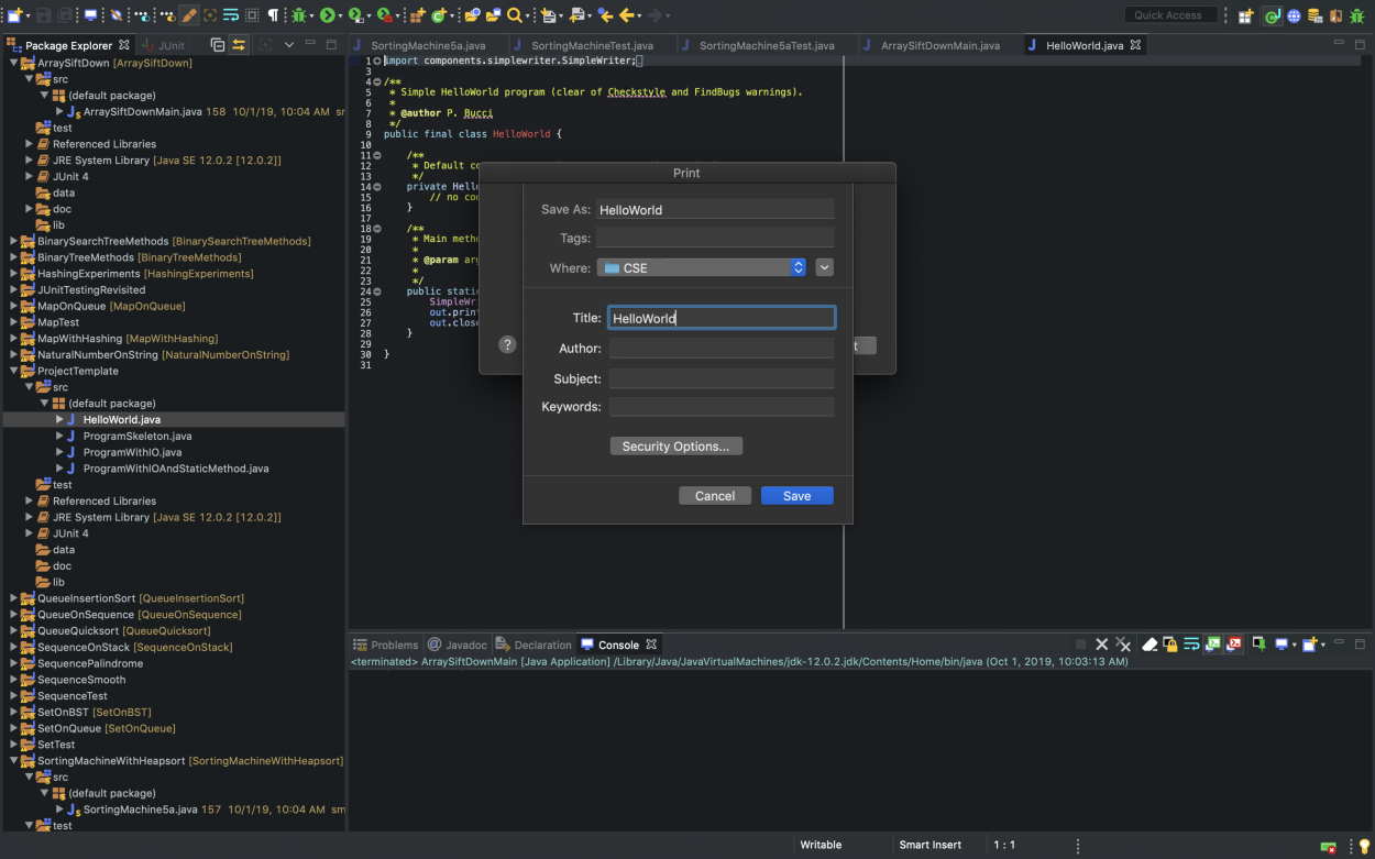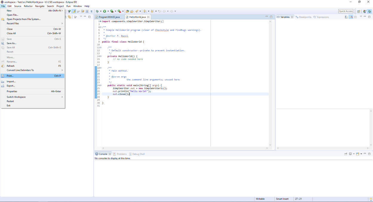 This document outlines how to submit projects in CSE 2221/2231. In general, a project submission will require uploading to Carmen a ZIP file of your assignment Eclipse project and also one or more PDF files that contain the source code for your project. (The only exception is Project #1 in CSE 2221 for which no PDF file will be submitted.) This will make it easier to leave detailed comments for your code. To get a PDF of your source code, you will need to use Eclipse's print function, but instead of sending it to a printer, you will print it to a PDF. This will produce a PDF file of your source code that we can comment on.