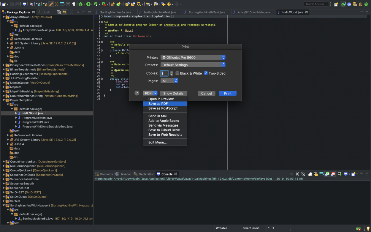 The following goes over the process for printing source code to a PDF for Eclipse on Mac.