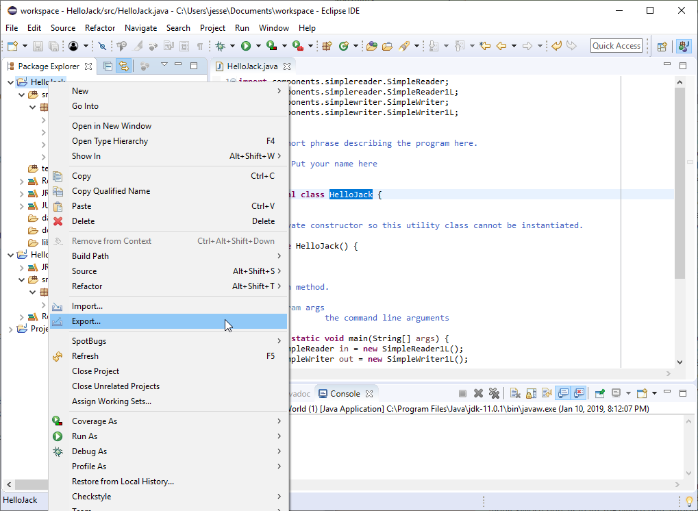 First, in the Package Explorer view, right-click on the project you wish to submit, and select Export... from the pop-up menu.