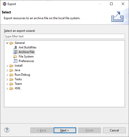 Next, in the Export window, expand the General entry and select Archive File. Click Next.
