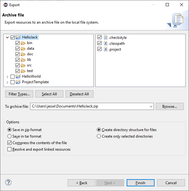 In the next window, make sure that the correct project and everything inside it is selected in the left panel, then in the To archive file box, enter the name of the ZIP file specifying a convenient location in the file system (you can either type the location directly or click the Browse... button to use a file selection dialog). Click Finish.